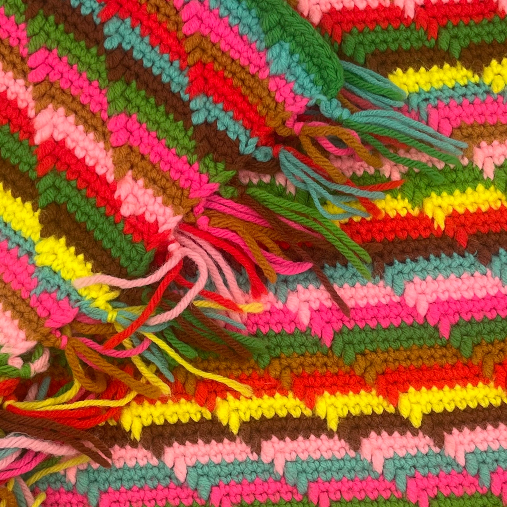 A vibrant handmade crochet afghan in cheerful retro hues: pinks, yellows, greens, and oranges, arranged in a bold chevron stripe pattern with fringe edging. The colors are pure vintage joy, adding a pop of warmth and nostalgia to any space.