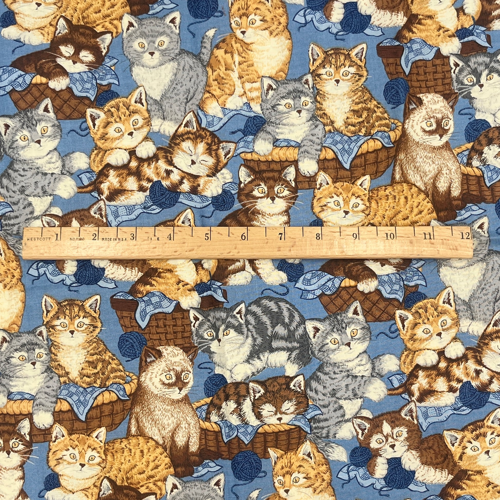 Premium quilting cotton featuring a playful print of kittens in baskets with blue yarn balls on a denim-blue ground. Unwashed, crisp, clean, quilt-ready condition.