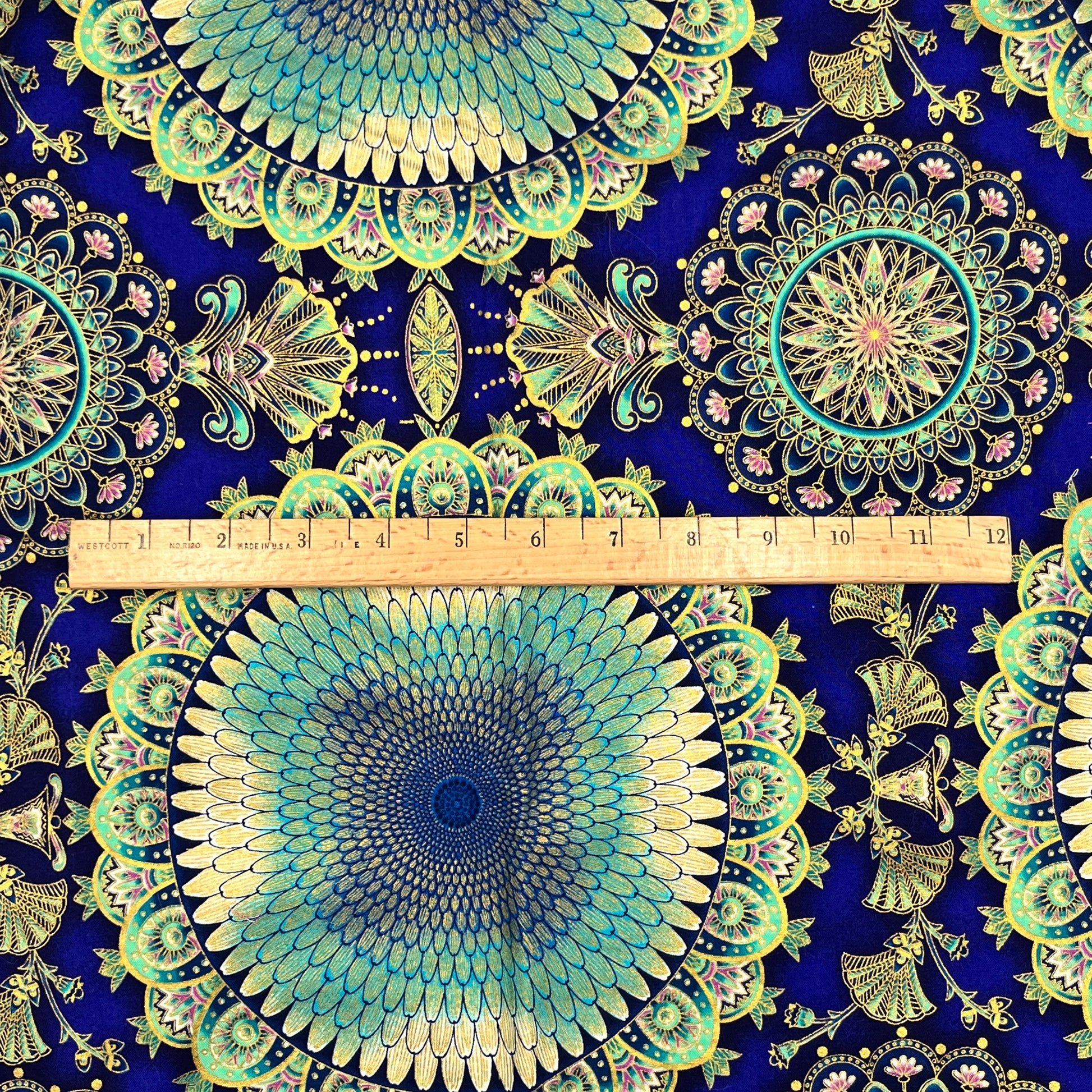 This intricate mandala pattern in shimmering gold metallic against a deep sapphire blue background in peacock-toned greens and turquoise, gives a rich, jewel-box feel. It's perfect for quilting, statement apparel, or luxe home accents.