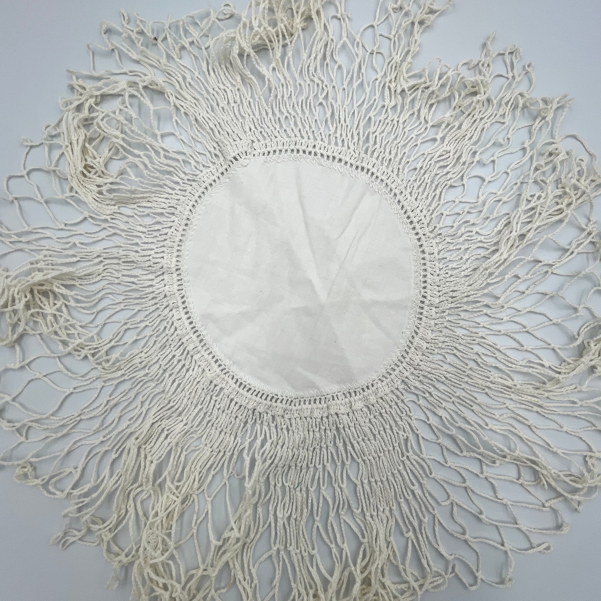 A beautiful cotton doily featuring a smooth woven center and an intricate macramé-style knotted fringe. Its organic, sunburst design gives it a touch of bohemian charm. Perfect as a layering piece for table styling, under pottery or candles, or repurposed into textile art or upcycled décor.