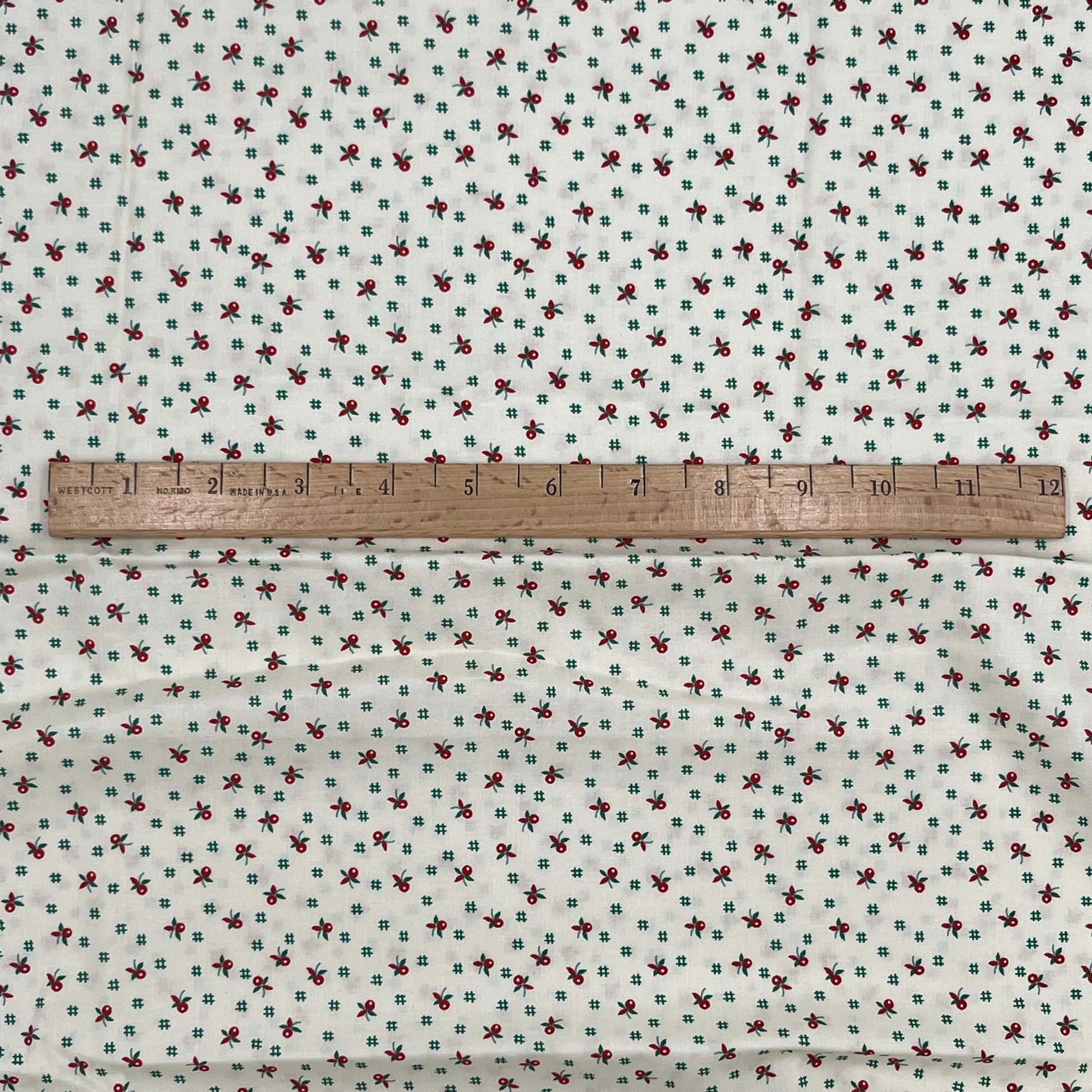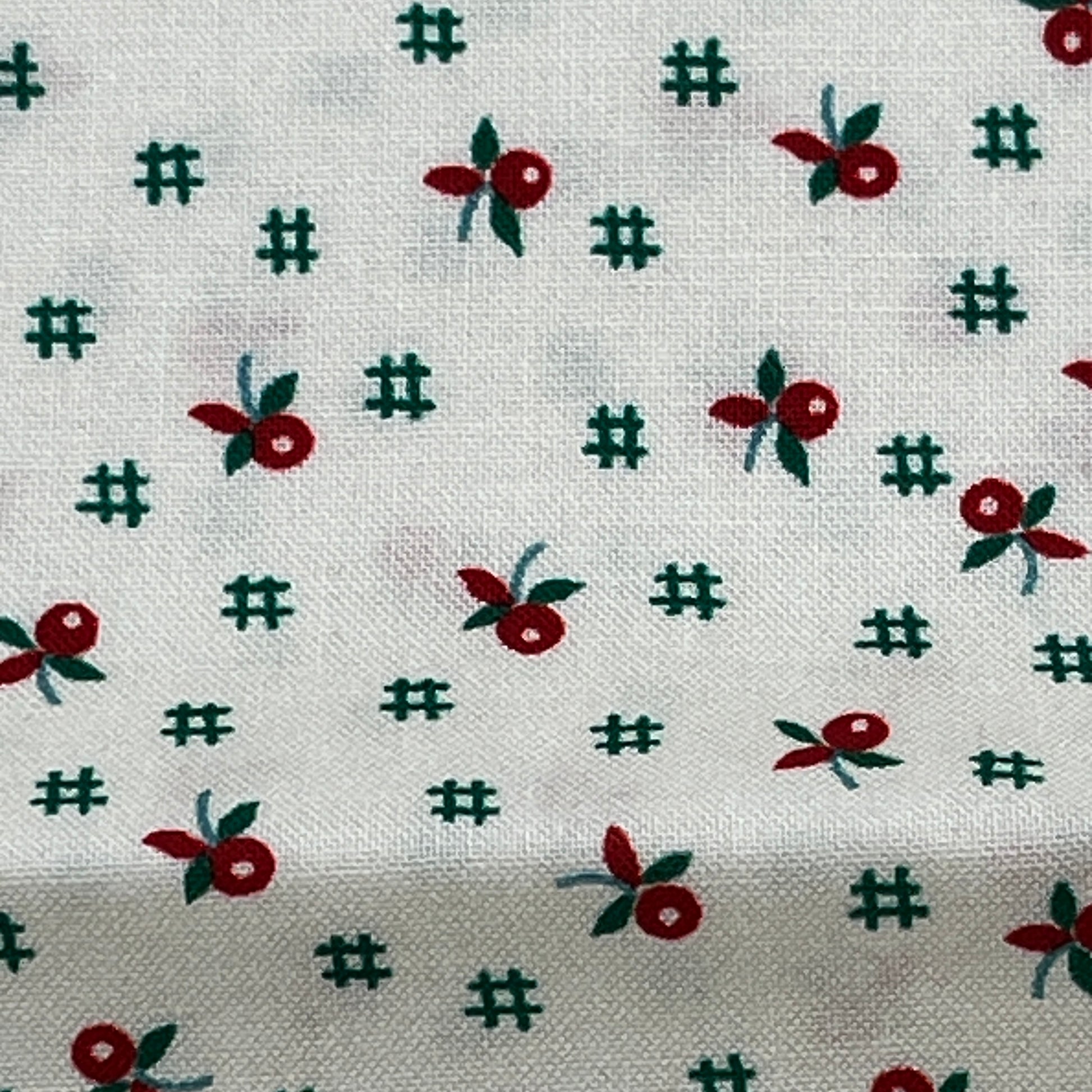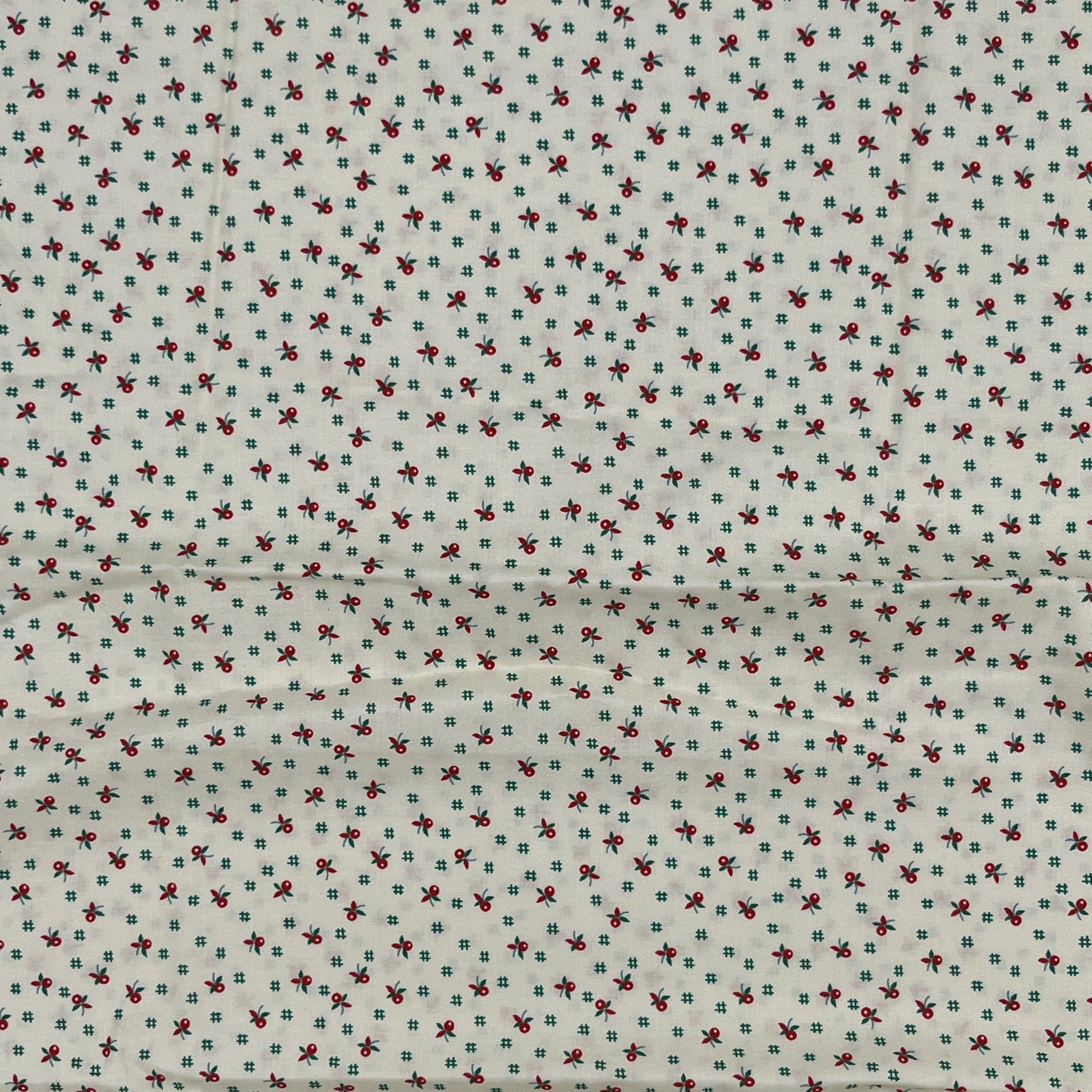 Charming vintage-inspired print from Robert Kaufman. Tiny red berries with green sprigs scatter across a soft cream background. A sweet and timeless quilting cotton perfect for seasonal sewing.