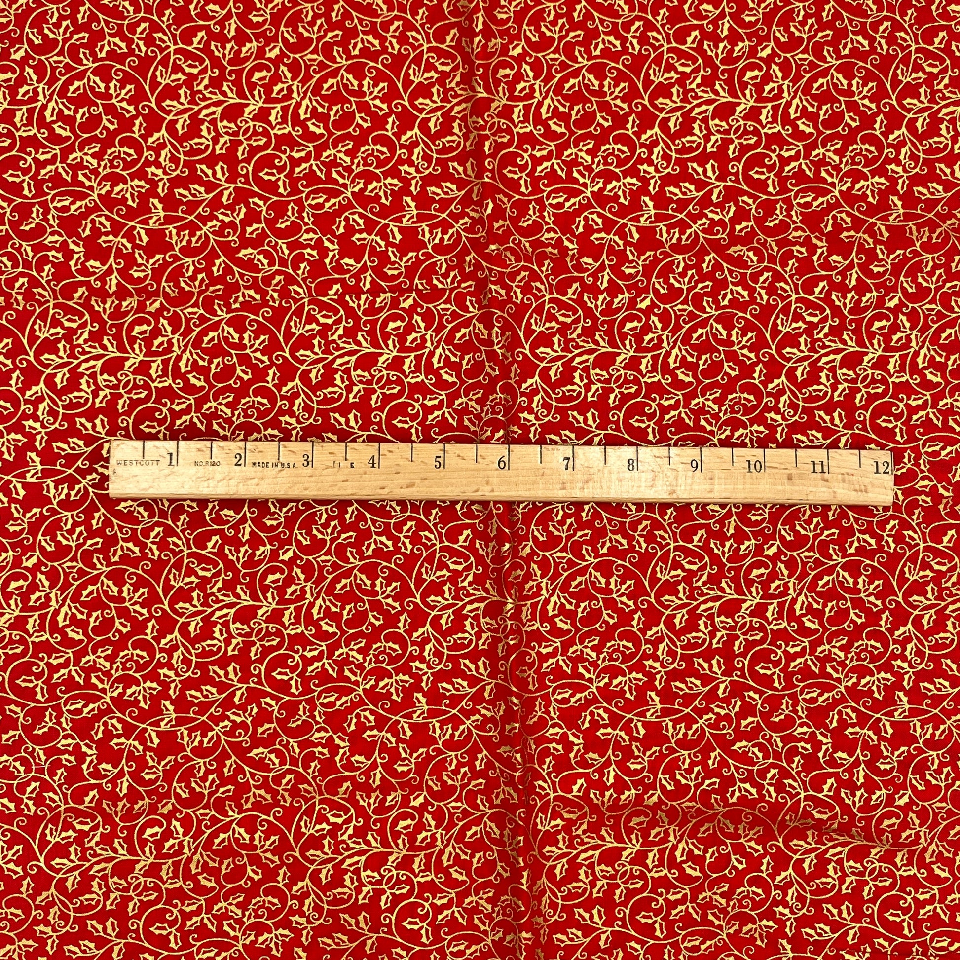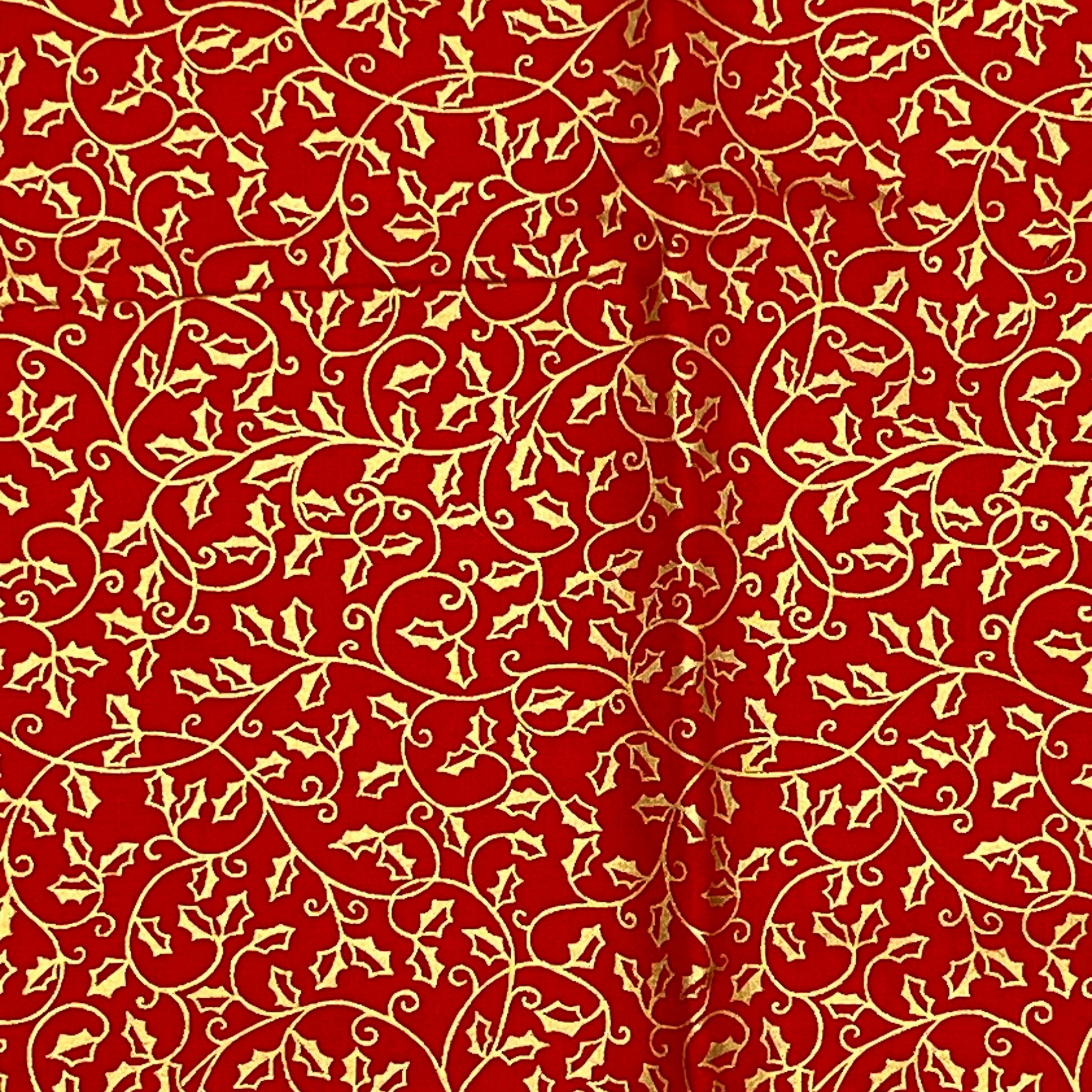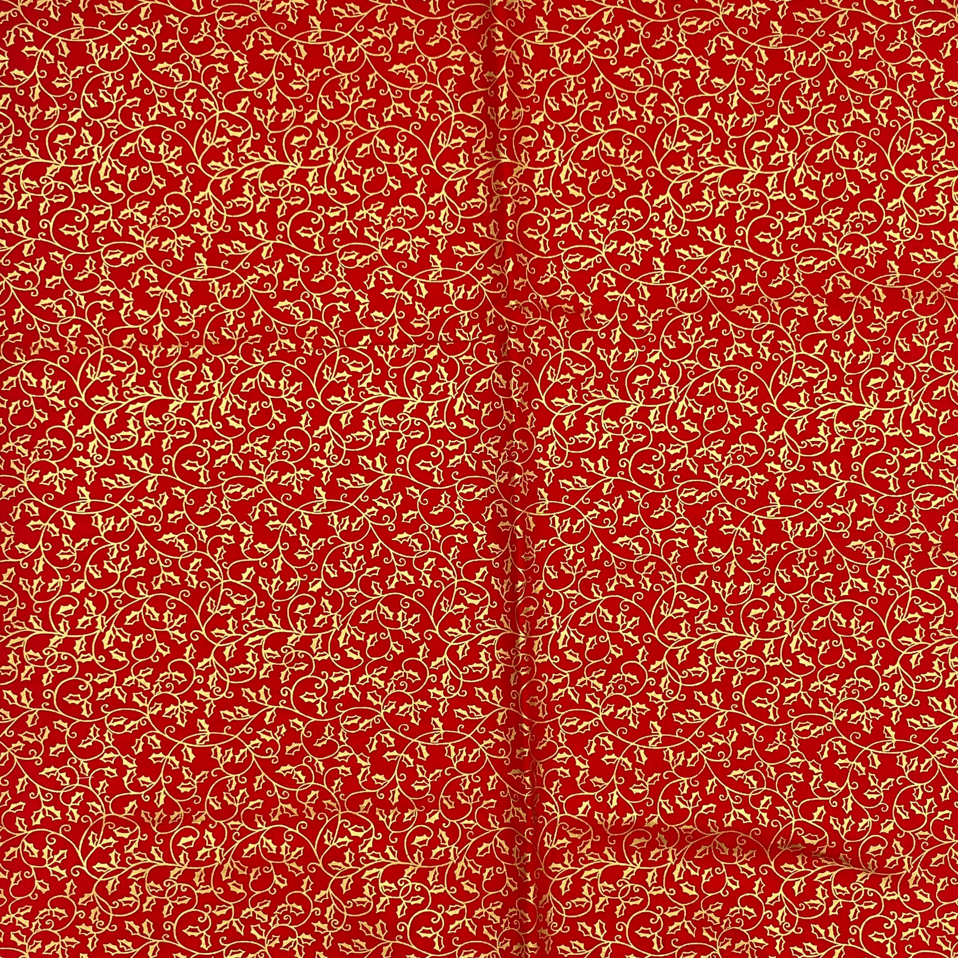 Crimson red with metallic gold holly leaves and scrollwork. A festive print from Makower UK, ideal for holiday quilting, table linens, or decorative sewing projects.