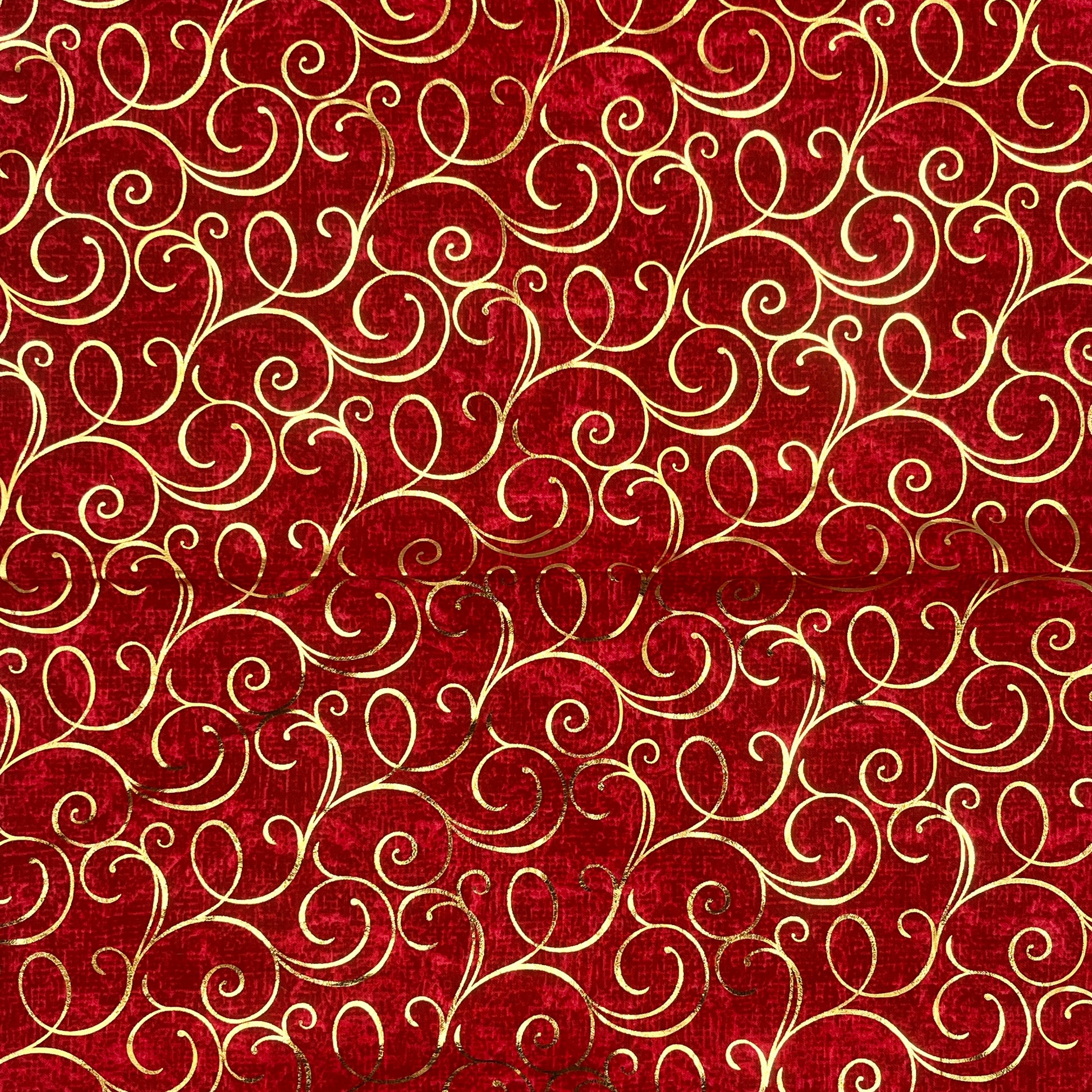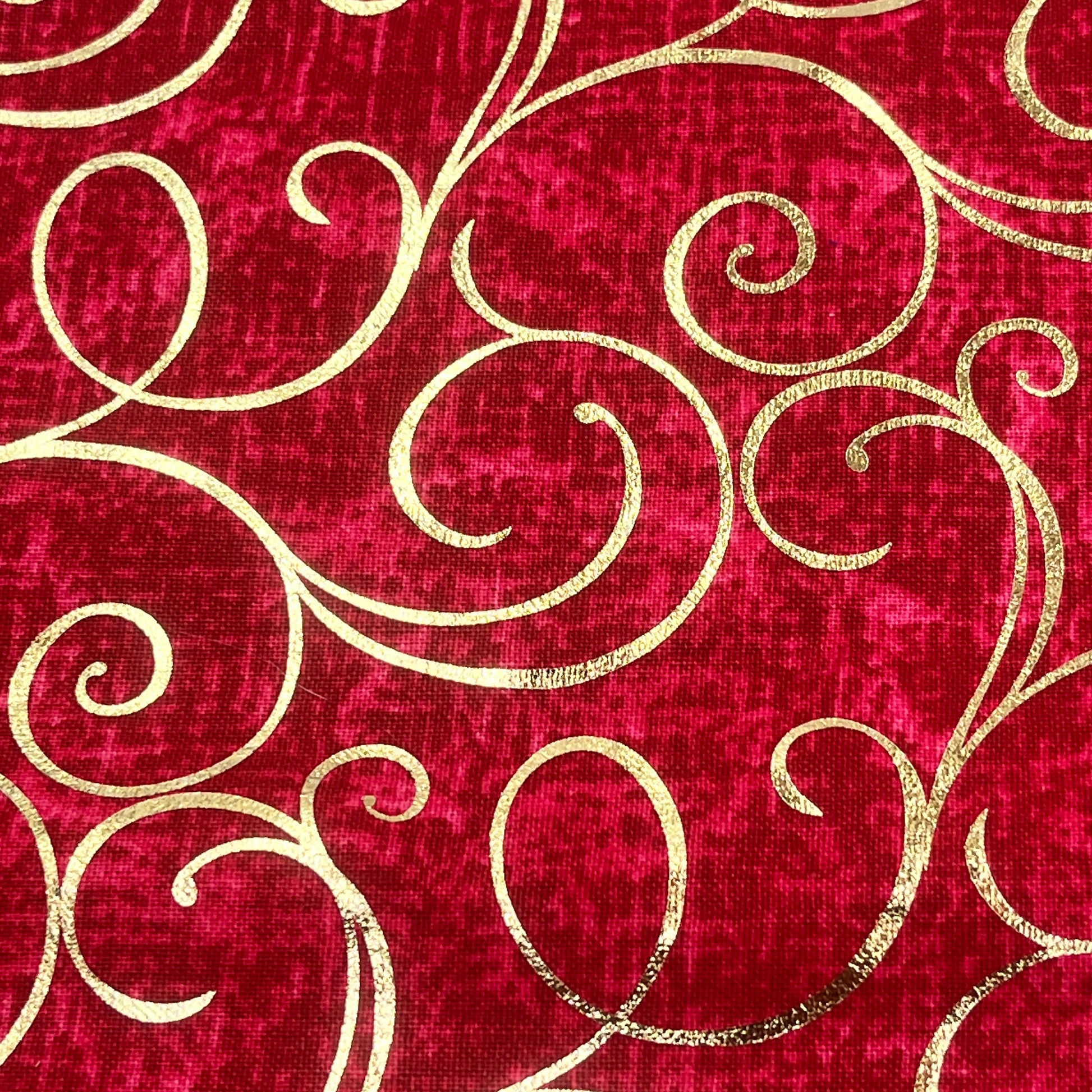 3 Pieces of holiday red quilting cotton with metallic gold swirl print. Perfect for holiday sewing projects. Use for stockings, table décor, or patchwork accents. Unwashed, crisp, clean, quilt-ready condition