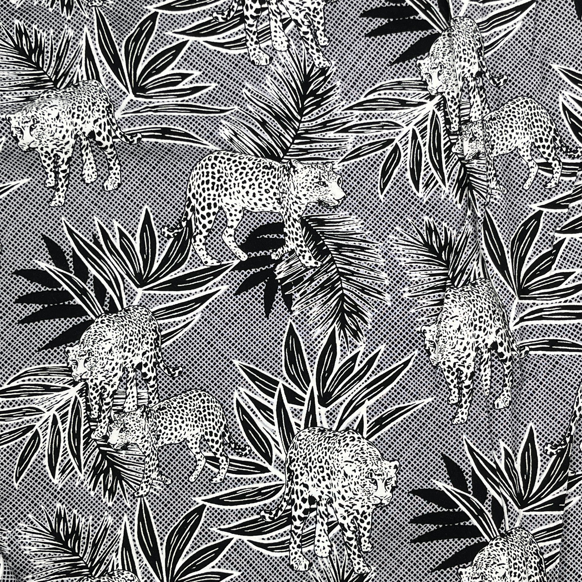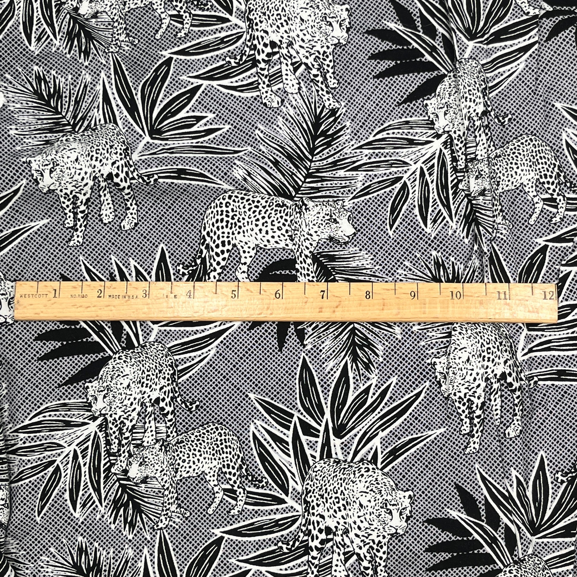 Striking black and white leopard print rayon challis with bold tropical leaves. Lightweight with a soft, fluid drape, perfect for dresses, blouses, skirts, or wide-leg pants.