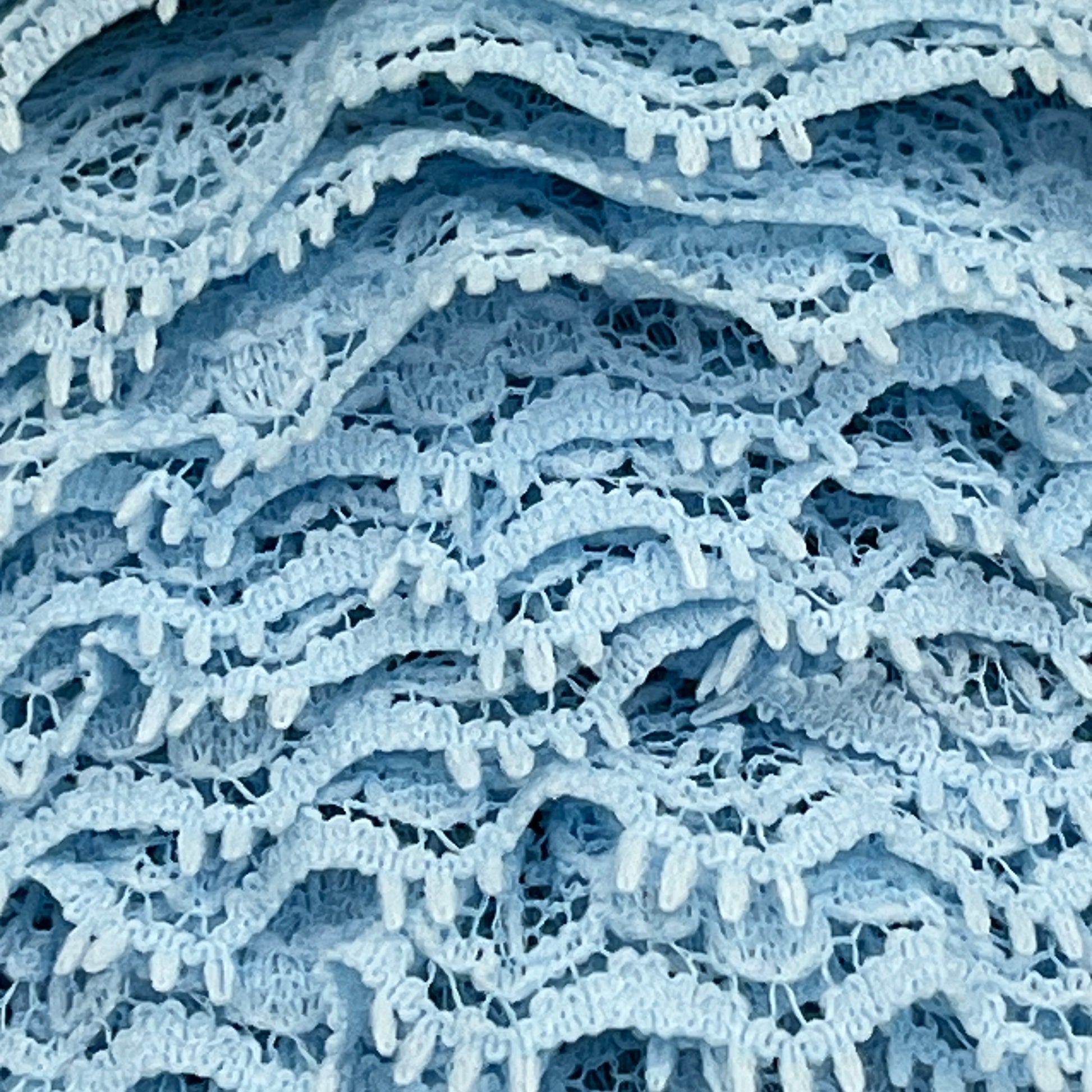 Soft, airy, and sweetly detailed, this baby blue lace trim features layered ruffles and petite looped edging for a touch of vintage charm.
