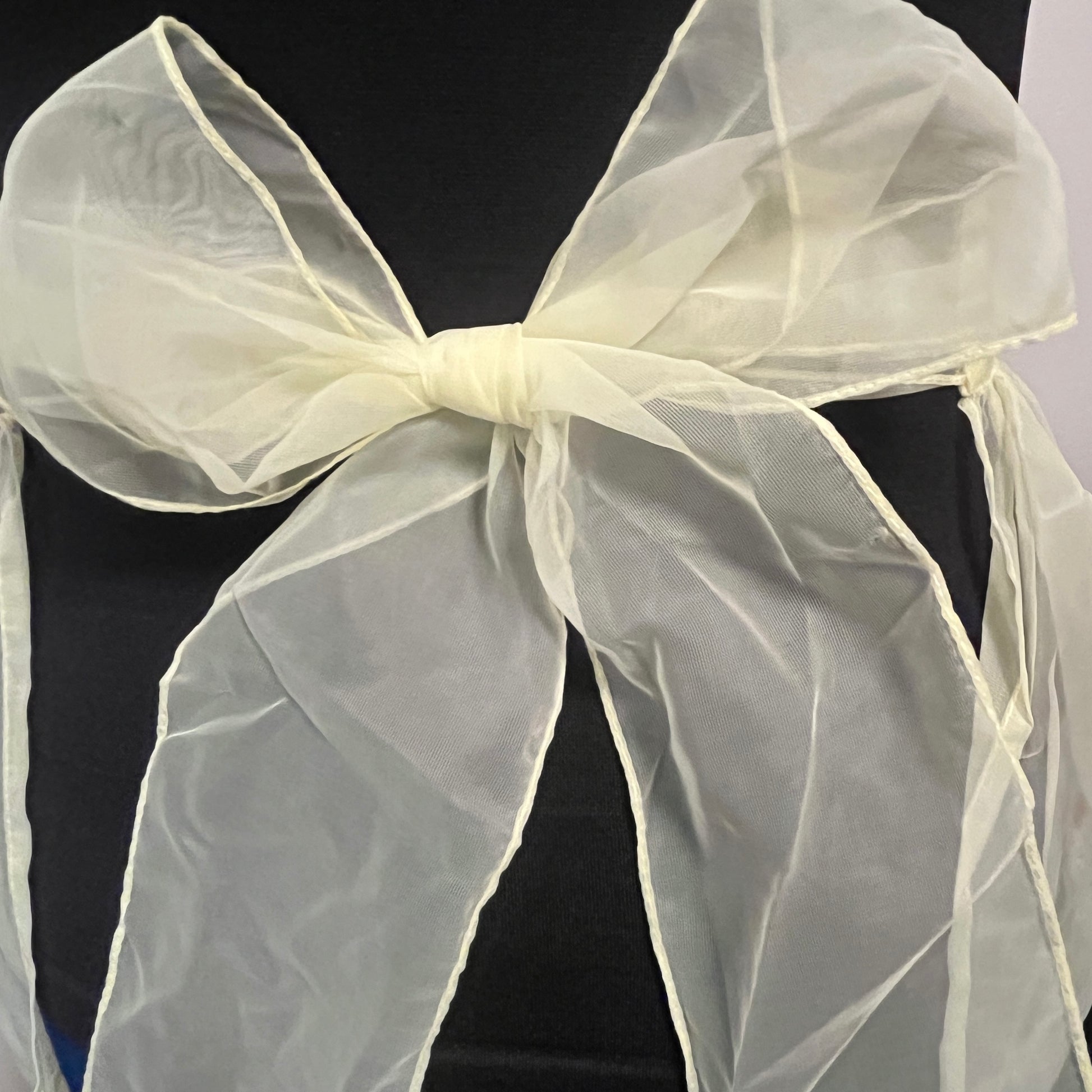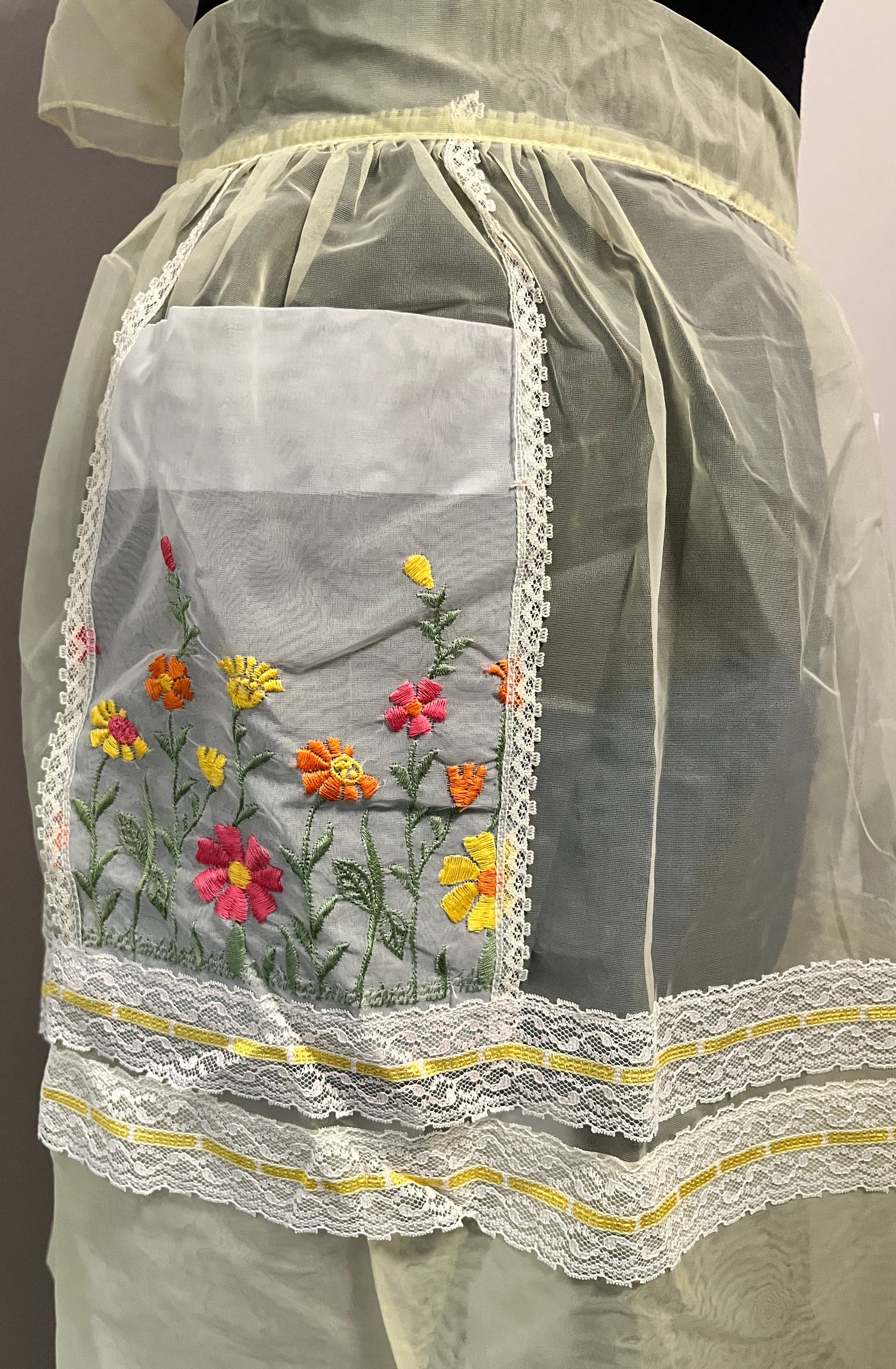 Crisp light yellow organza with embroidered pockets trimmed with lace and sunshine-yellow ribbon.