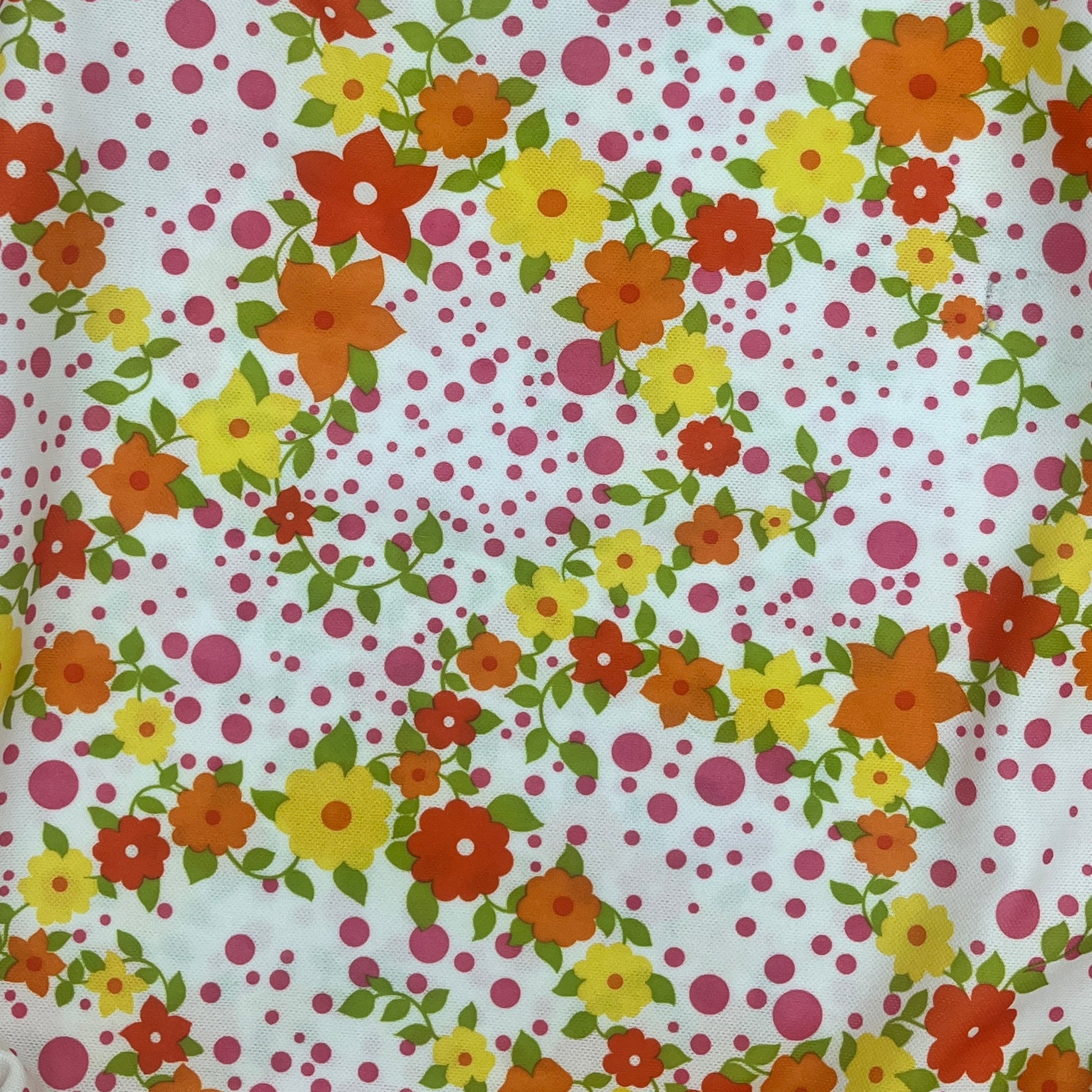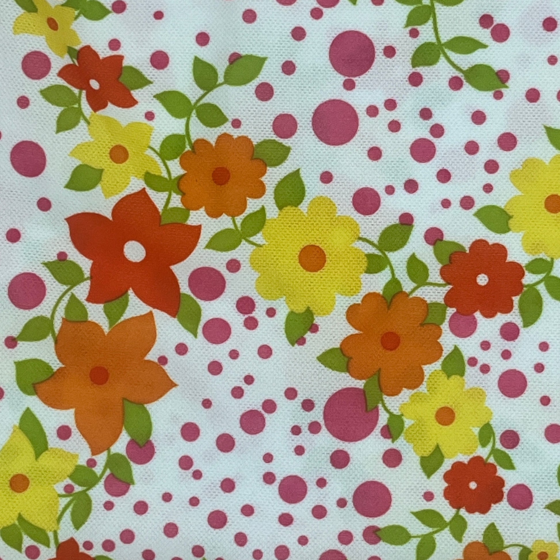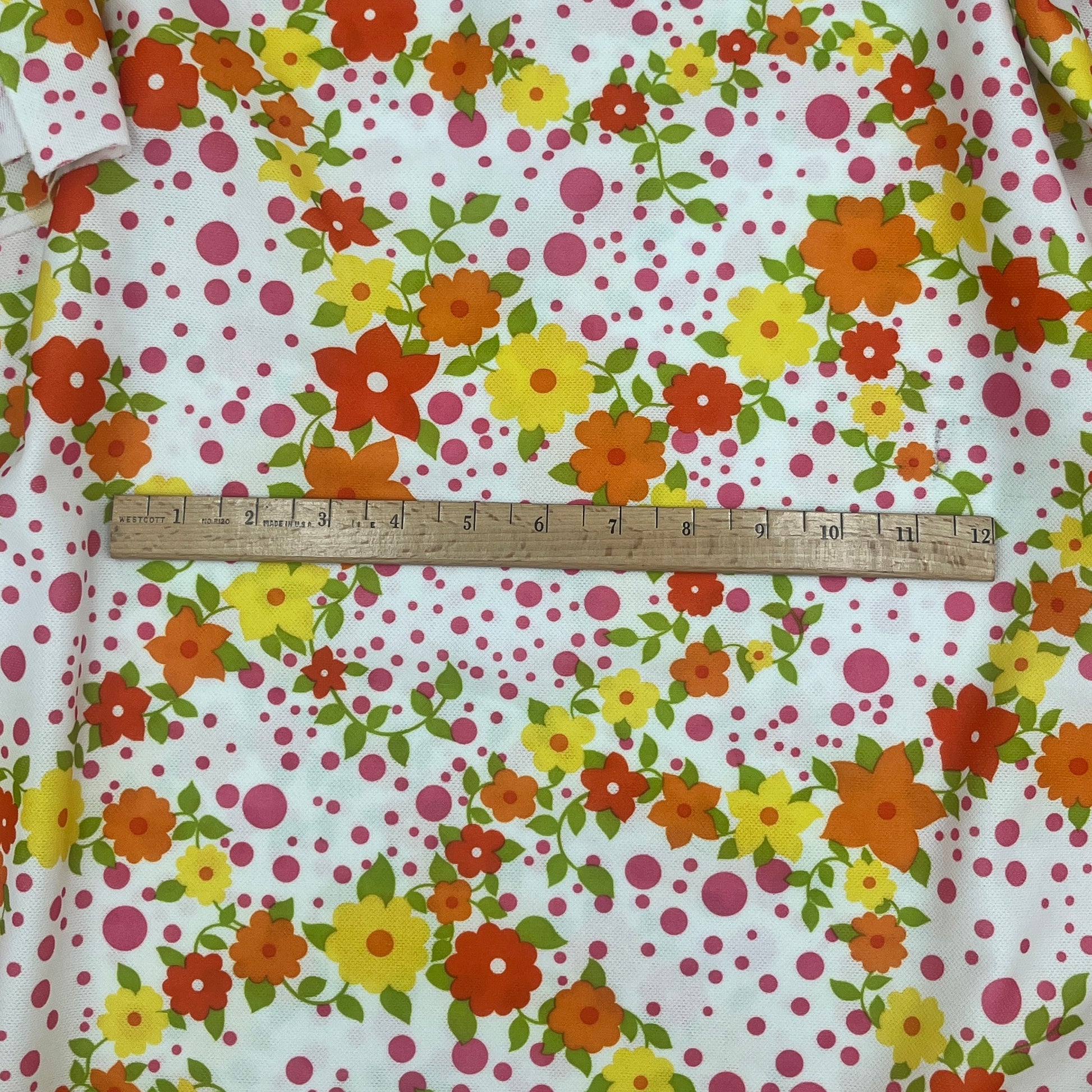 This poly knit is bursting with oversized daisy energy. Sunny oranges, citrusy yellows, and a hot pink punch all set against a creamy white base. Horizontal stretch, midweight, and ready to bring the retro back..