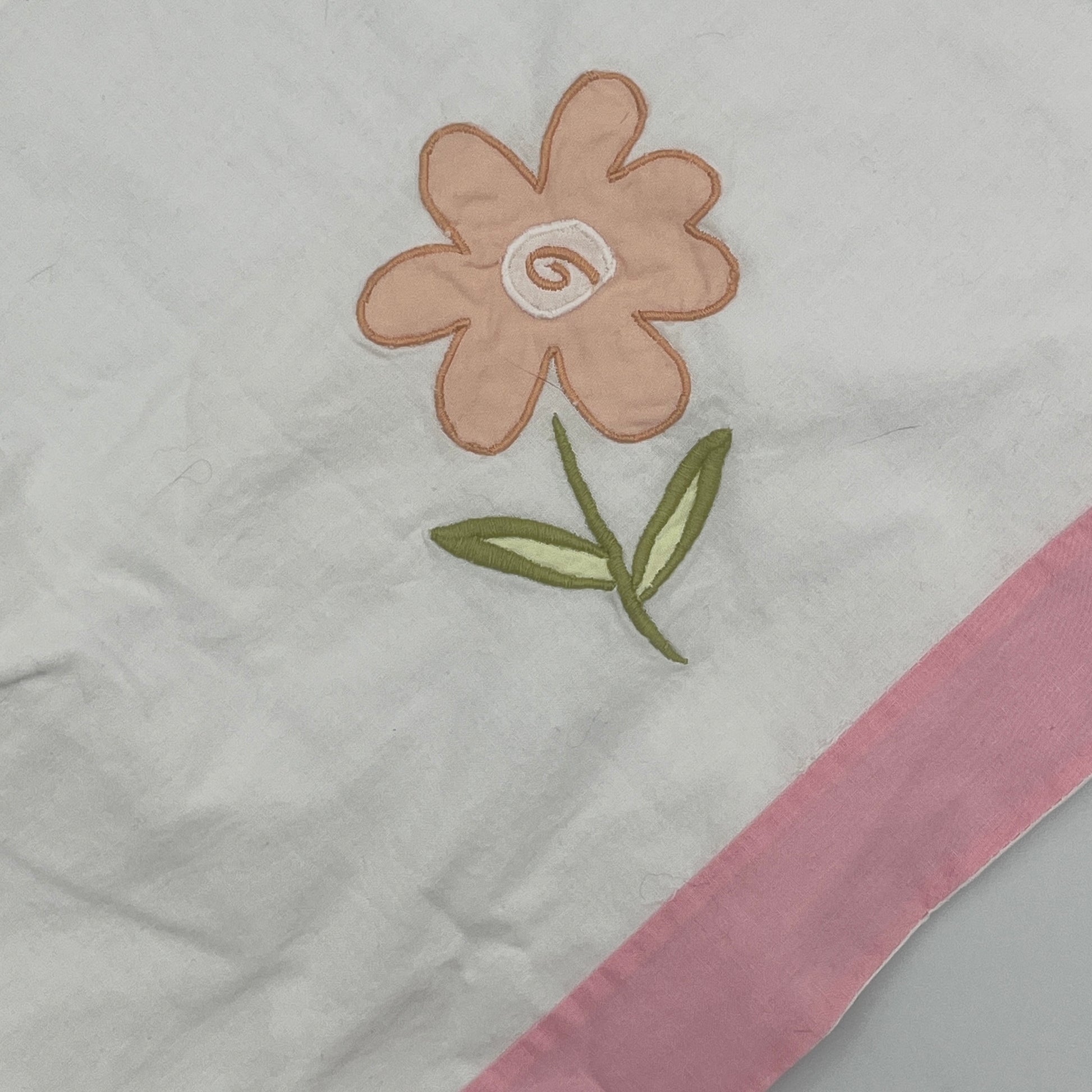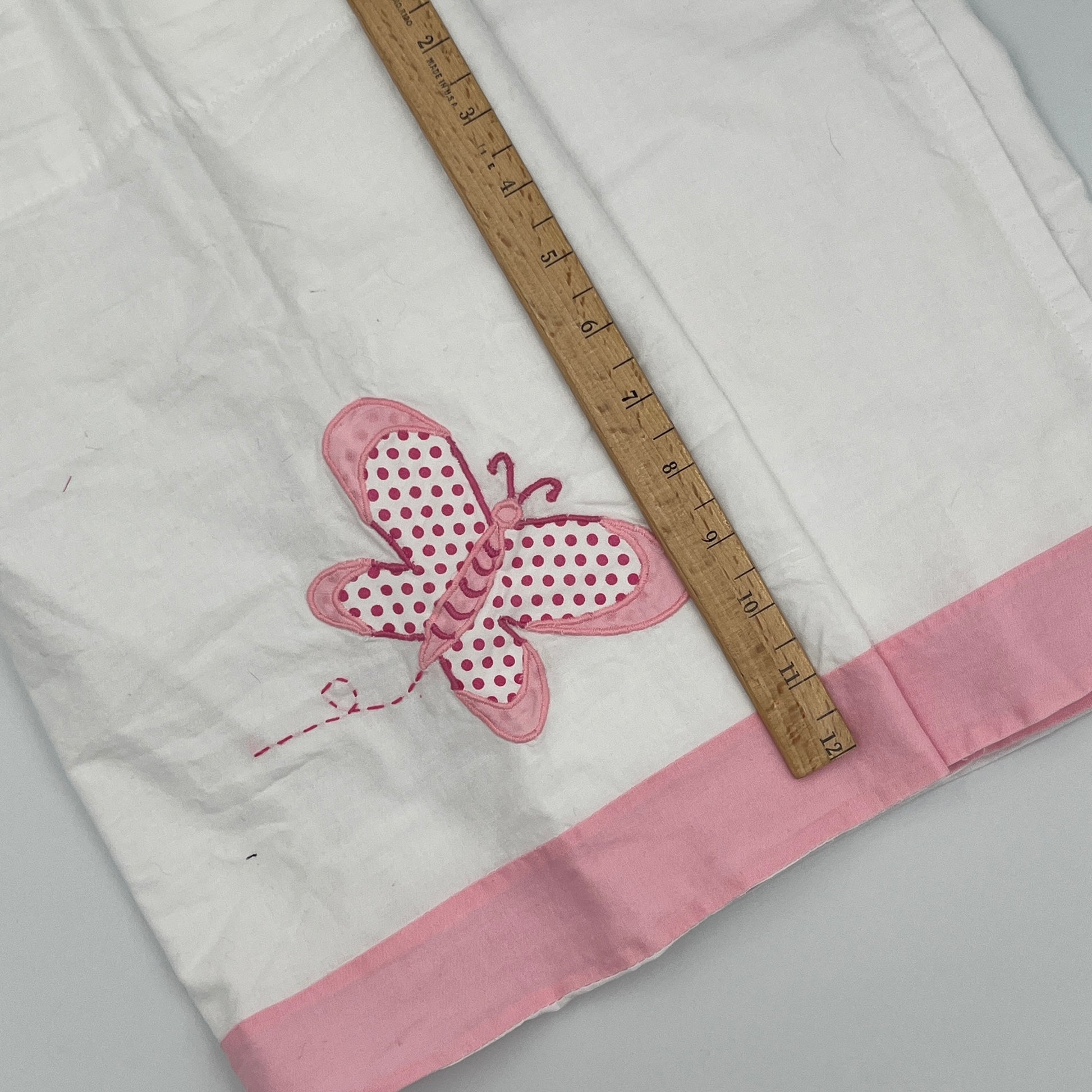 Sweet and sunny cotton valance featuring pastel appliqué flowers and a polka-dot butterfly stitched along a crisp white background with a pink border. Use as is, or for upcycling.